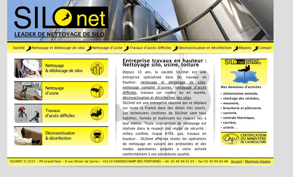 Depuis 10 ans, la société SILOnet est une entreprise spécialisée dans les travaux en hauteur: nettoyage et déblocage de silos,nettoyage complet d’usines, nettoyage d’accès difficiles, travaux sur cordes ou en nacelle,désinsectisation et désinfection des silos.